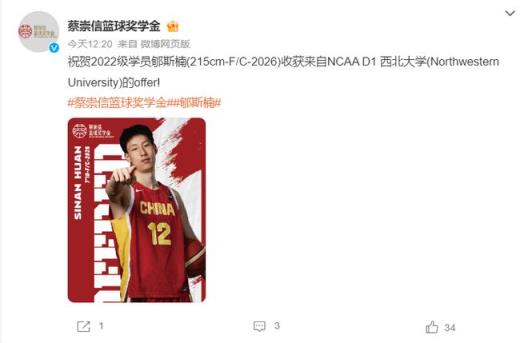 這場比賽后郇斯楠的表現(xiàn)也引起了美國方面的關(guān)注,據(jù)悉他獲得了NCAA一級(jí)聯(lián)盟西北大學(xué)的Offer。