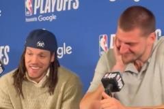 賽后,掘金球星阿隆-戈登和約基奇出席了新聞發(fā)布會。對于約基奇三分不進自己補扣絕殺那球,戈登打趣約基奇:“傳得漂亮。Airballs(三不沾)真的很難防守。”