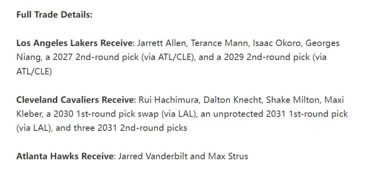 湖人得到:賈萊特-阿倫、特倫斯-曼恩、奧科羅、尼昂、2027年騎士/老鷹次輪、2029年老鷹/騎士次輪;