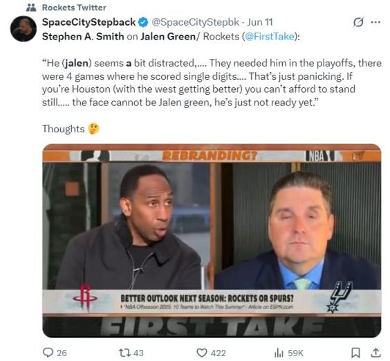 近日,TNT名嘴斯蒂芬-A-史密斯在播客節(jié)目中再度談到休斯頓火箭隊(duì),他談到了火箭作為西部第二倒在首輪,他說(shuō)道:“我們都知道杰倫-格林是從未證明過(guò)自己的得分手,如果不是他7場(chǎng)比賽4場(chǎng)不上雙,火箭可能都進(jìn)入西部決賽了,他的表現(xiàn)遠(yuǎn)沒(méi)有 達(dá)到人們預(yù)期的表現(xiàn)?!?/p>