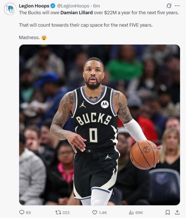 根據(jù)美媒LH的報(bào)道,在未來的五年里,雄鹿每一年都需要向利拉德支付2250萬,這些薪水也會(huì)占據(jù)雄鹿每一年的薪金空間。