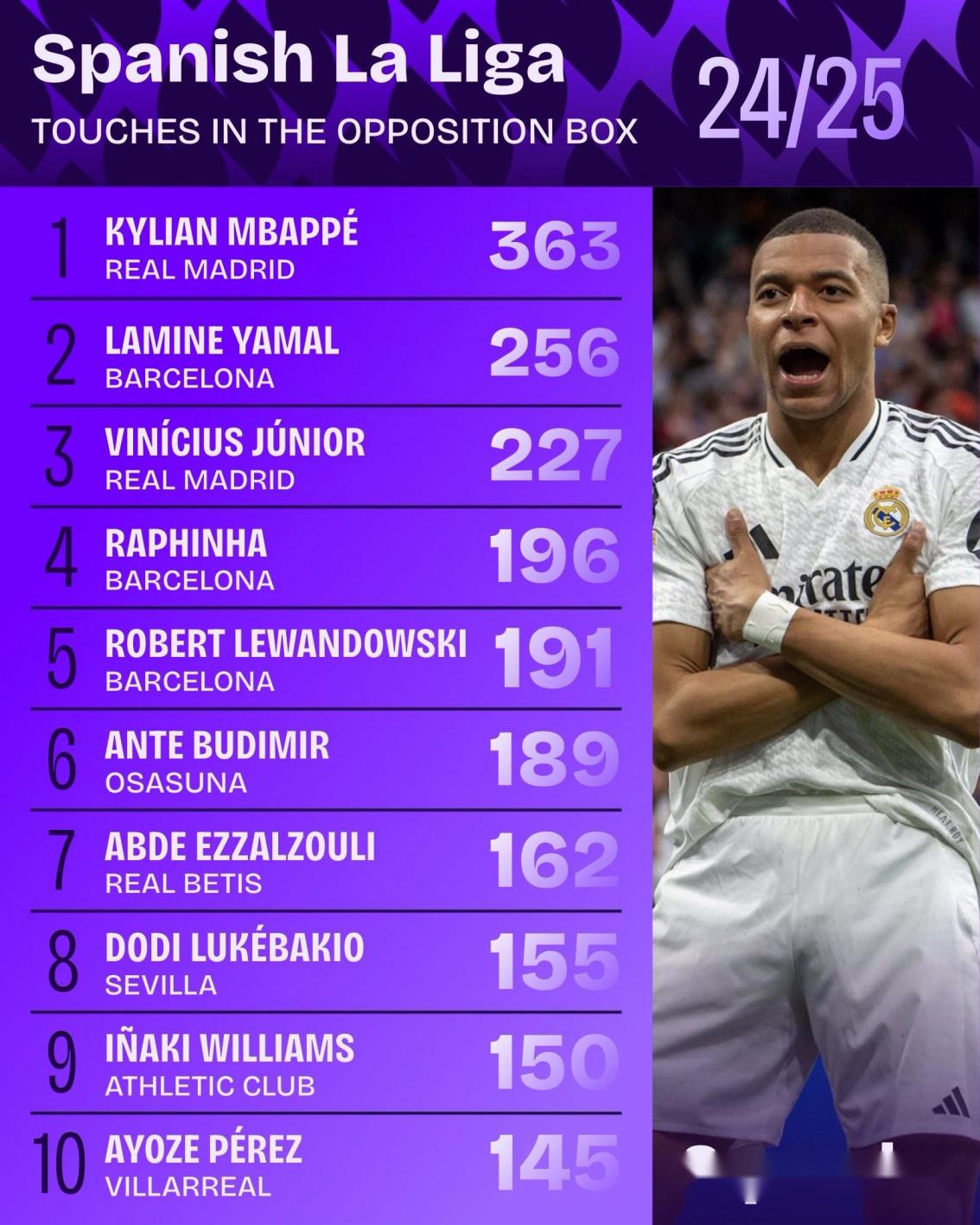 據統(tǒng)計,皇家馬德里的姆巴佩是本賽季西甲聯(lián)賽在對方禁區(qū)內觸球次數最多的球員。