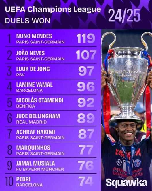 在周日凌晨進(jìn)行的歐冠決賽中,巴黎5-0擊敗國米奪冠,根據(jù)統(tǒng)計(jì),努諾-門德斯是本賽季歐冠當(dāng)中成功對(duì)抗次數(shù)最多的球員。