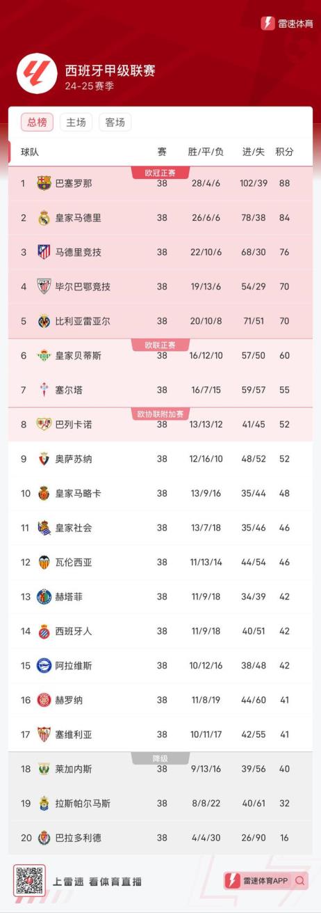 雷速體育5月26日訊 隨著巴薩3-0擊敗畢爾巴鄂競技,本賽季西甲38輪比賽全部結束。