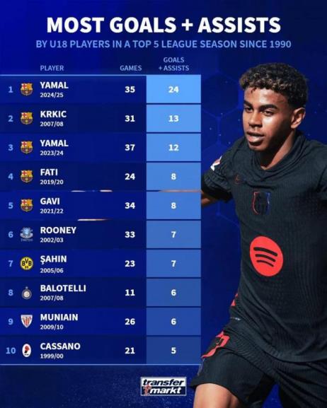 5月27日訊 德國(guó)轉(zhuǎn)會(huì)市場(chǎng)統(tǒng)計(jì)了1990年以來(lái)五大聯(lián)賽U18球員單賽季參與進(jìn)球的數(shù)量,并列出榜單,本賽季亞馬爾參與24球居首,前3名獨(dú)占2席。