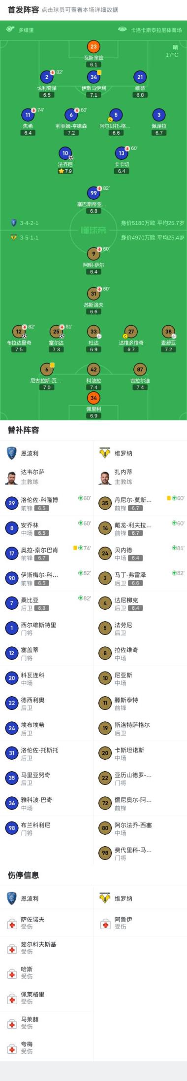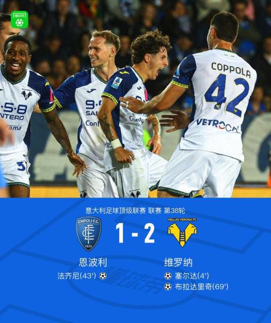 在北京時間5月26日進(jìn)行的意大利足球甲級聯(lián)賽第38輪比賽中,恩波利主場迎戰(zhàn)維羅納。比賽中,維羅納由塞爾達(dá)率先打破僵局,隨后恩波利憑借法齊尼的進(jìn)球?qū)⒈确职馄健>S羅納的布拉達(dá)里奇在比賽后半段再入一球,幫助球隊再度領(lǐng)先。最終,恩波利1-2不敵維羅納。