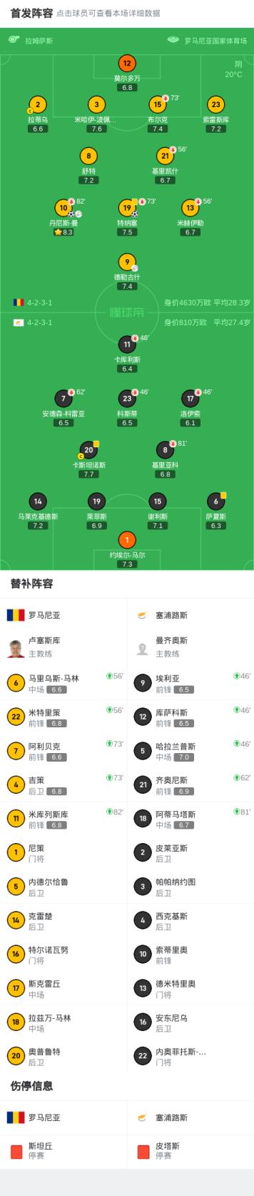 上半場補時第2分鐘,羅馬尼亞球員德勒古什助攻丹ity-曼打入一球。