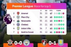 05月11日訊 英超第36輪曼城0-0戰(zhàn)平南安普頓,維拉1-0擊敗伯恩茅斯,英超爭(zhēng)五的形勢(shì)更加復(fù)雜。