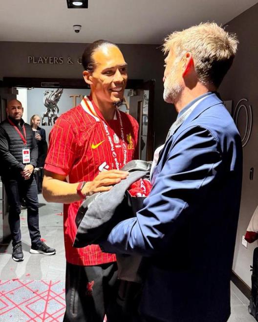 在現(xiàn)場見證利物浦捧起2024-25賽季英超冠軍獎(jiǎng)杯后,克洛普在社交媒體曬出他和繼任者斯洛特的合照,利物浦隊(duì)史兩位英超冠軍主帥同框。