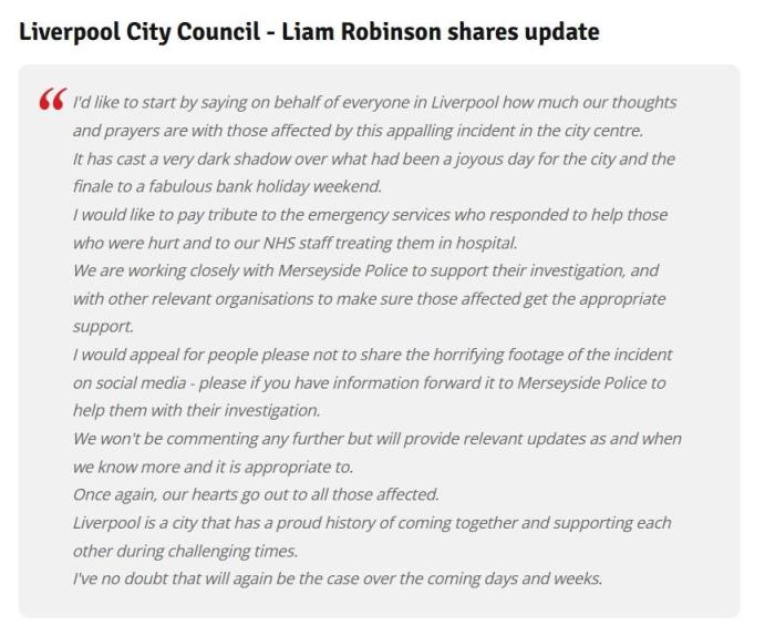 當?shù)貢r間5月26日,在利物浦進行奪冠游行時,一輛汽車在沃特街與戴爾街附近沖入了慶祝的人群。這一事件后,利物浦市議會的Liam Robinson發(fā)表了聲明。