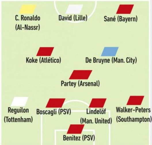 前鋒:C羅(利雅得勝利)、戴維(里爾)、薩內(nèi)(拜仁)