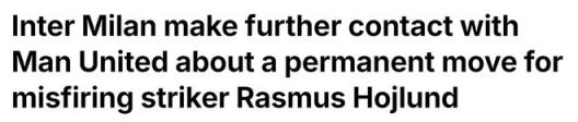 據(jù)悉,國米希望先租后買,一旦霍伊倫德的表現(xiàn)達(dá)到設(shè)定指標(biāo),就必須強(qiáng)制性買斷。但曼聯(lián)還沒有開放出租之門,堅(jiān)持要永久轉(zhuǎn)會(huì)。《每日郵報(bào)》稱,如果曼聯(lián)同意把價(jià)格降得更低,藍(lán)黑軍團(tuán)也有可能同意直接買下,他們已經(jīng)就永久轉(zhuǎn)會(huì)的可能性與紅魔進(jìn)行了進(jìn)一步的接觸。
