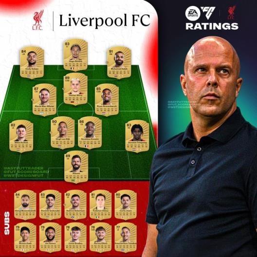 權(quán)威FC博主ASY公布了利物浦球員在《FC26》中的能力值,其中,薩拉赫91、范戴克90、維爾茨89、?;倏?3。