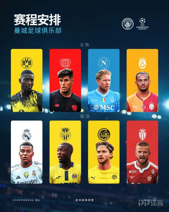 歐足聯(lián)官方公布了歐冠聯(lián)賽階段的賽程,曼城的賽程如下。